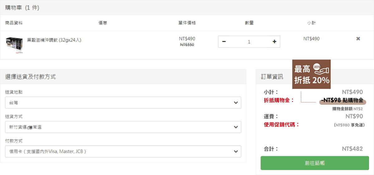 • 當帳戶內有效期內購物金,結帳時系統會自動帶入折抵金額(優惠商品不能併用,最高可折抵消費金額 20%);若需要減少折抵的購物金,可於結帳頁的「訂單資訊」區塊點選「折抵購物金」,自行修改需要折抵的購物金(最高可折抵消費金額 20%),按下「套用」後,即可完成修改。